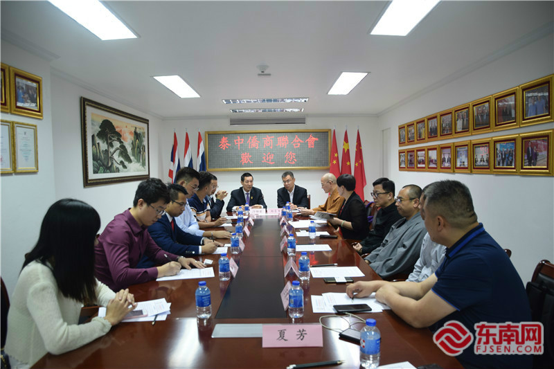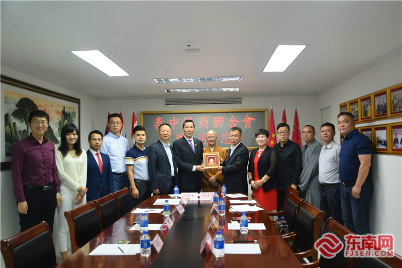 賓主合影,互贈紀念品。 東南網泰國12月22日訊(本網記者 夏芳 文/圖)22日,以福建省政協常委、福建佛學院院長、福州開元寺方丈、中華禪倡導者與導師本性禪師為特邀顧問,福建省對外文化交流協會副會長鄭東育為團長的“中華禪文化泰國行”福建交流團(下簡稱“交流團”)一行9人,在曼谷到訪泰中僑商聯合會,受到該會會長鄺錦榮等人的熱情接待。雙方就如何抓住“一帶一路”發展機遇,推動中華優秀傳統文化走出去,促進泰國與福建各領域交流合作進行友好座談。