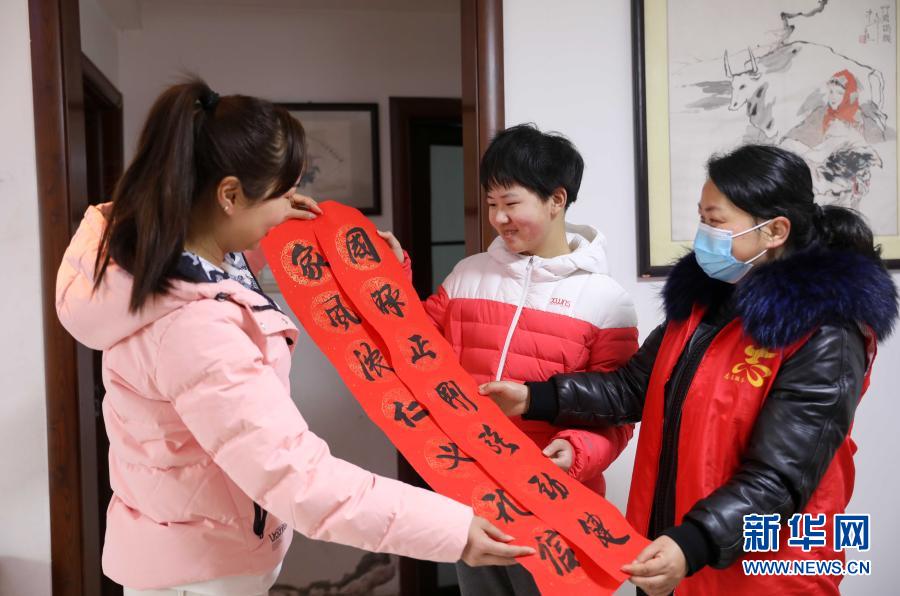 1月27日,社區志愿者將春聯送到留在合肥過年的外來務工人員家中。新華社記者 曹力 攝