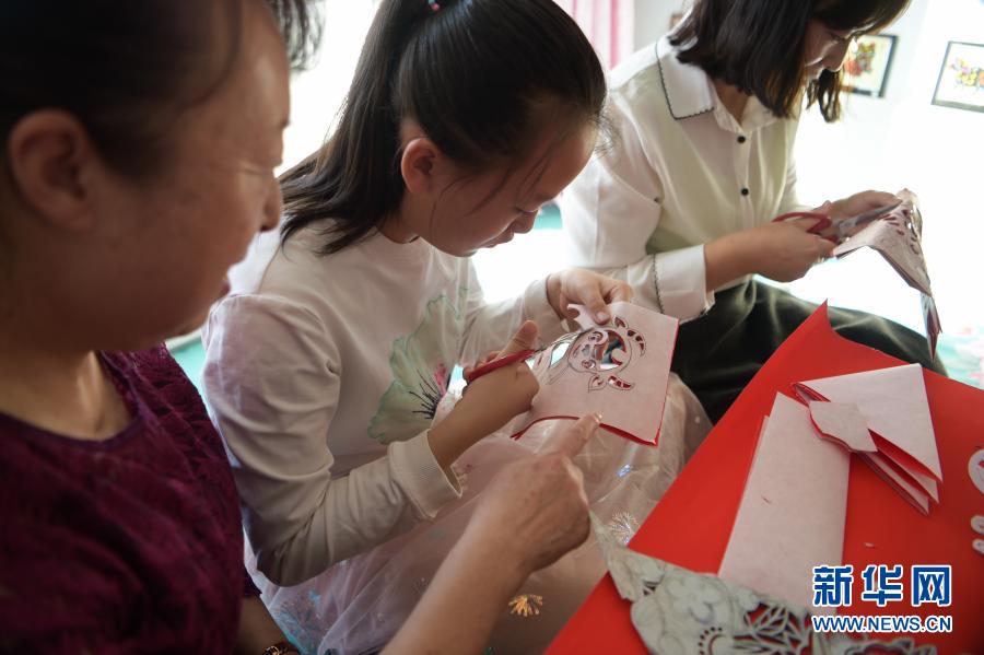 2月21日,在烏海市海南區新橋花園,李華(左)在家中指導外孫女高宇晨(中)剪紙。新華社記者 李志鵬 攝