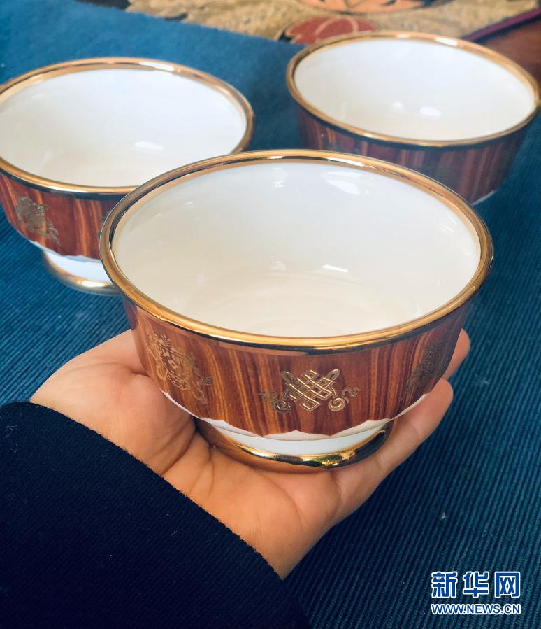 這是出席2015年西藏自治區成立50周年慶祝活動的中央代表團贈送給西藏農牧民的骨質瓷酥油茶杯套裝(2月5日攝)。新華社記者 孫非 攝 |
