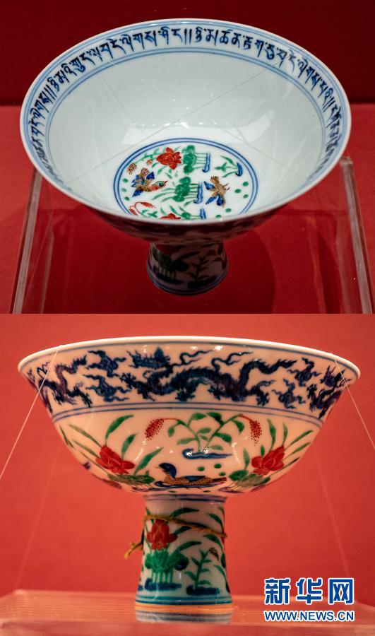 這張拼版照片顯示的是青花五彩蓮池鴛鴦紋高足碗(1月26日攝)。新華社記者 普布扎西 攝 宣德青花五彩碗和高足碗,繪有青花五彩蓮池鴛鴦紋,器底有“大明宣德年制”六字官款,碗內齊口一圈藏文,是迄今所發現燒造年代最早、保存最完好的宣德青花五彩器,也是明中央向薩迦寺賜送的實物見證。 “宮廷內帶有鮮明雪域風格的瓷器,是藏漢文化交流的結果。這種交流早在唐代開始,綿延1000多年從未間斷。”北京故宮博物院器物部陶瓷組副研究館員劉偉在一篇文章中寫道。 由藏族學者達倉宗巴·班覺桑布所著、成書于15世紀的《漢藏史集》,記錄了一段頗具傳奇色彩的有關瓷碗的故事。 第36代藏王都松芒波杰抱恙,一日見鳥銜樹葉飛來,王以之泡水飲用,病愈。遂命人尋葉,得知來自漢地,聽聞漢地有瓷碗,又派使臣求碗,唐王派技師入蕃域。從此,瓷碗生根藏地,備受人們喜愛。 西藏山南市瓊結縣下水鄉唐布齊村俗稱索那唐布齊,因各處堆放黑炭(藏語稱索那)而得名,便是當年燒制瓷碗之地。 西藏自元代納入中央政府行政管轄后,文化交融、民間交往愈加繁盛,大量元青花瓷器流入藏地。