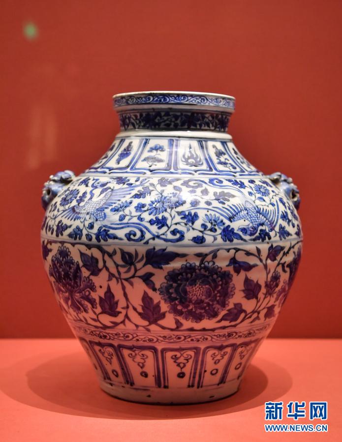 布達拉宮宮藏元代青花鳳穿牡丹紋罐(1月26日攝)。新華社記者 晉美多吉 攝 布達拉宮宮藏元代青花鳳穿牡丹紋罐便是實證。 布達拉宮管理處副處長索南航旦介紹,從過往歷史可見,景德鎮御窯廠瓷器在與藏文化交流中,極大地融入了西藏的傳統審美,出現了一批明顯帶有西藏傳統文化元素及藏傳佛教色彩的新器型,如多穆壺、僧帽壺等;裝飾紋上出現了如吉祥八寶、方形蓮瓣、藏梵字紋等。