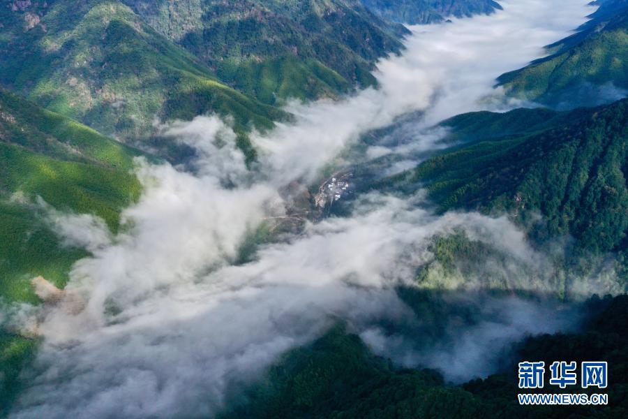 2020年12月1日,武夷斷裂帶峽谷內云霧繚繞,村莊若隱若現(無人機照片)。新華社記者 姜克紅 攝