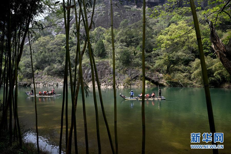 3月22日,游客在武夷山國家公園九曲溪乘竹筏游覽。新華社記者 姜克紅 攝