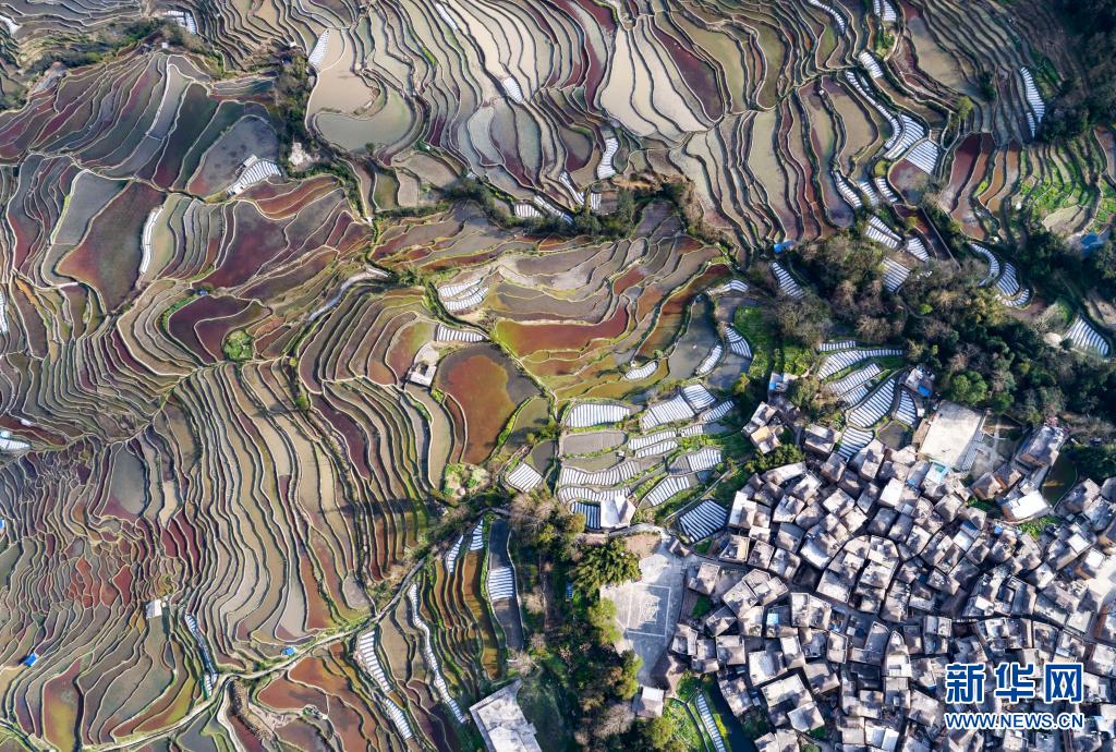 這是哈尼梯田景觀(2月24日攝,無人機照片)。新華社記者 陳欣波 攝 哈尼人利用復雜的水渠系統(tǒng),將水從樹木繁盛的山頂引入梯田,構(gòu)建出森林、村寨、梯田、水系“四素同構(gòu)”的循環(huán)農(nóng)業(yè)生態(tài)系統(tǒng)。當?shù)厝罕妭鞒凶孑叺奈幕图妓嚕剿靼l(fā)展和保護協(xié)同共生的路徑,書寫動人的生態(tài)故事。 千年的傳承 “這輩子和梯田分不開了!”43歲的哈尼族漢子朱文珍,是世界遺產(chǎn)哈尼梯田元陽管理委員會專職副主任。奶奶是農(nóng)耕能手,爺爺和父親是哈尼古歌歌者,3歲時學唱古歌,10多歲學會梯田耕作工序……朱文珍身上梯田印記明顯。他說,梯田里有人與自然和諧共生的密碼,梯田精神就是自強不息、天人合一。