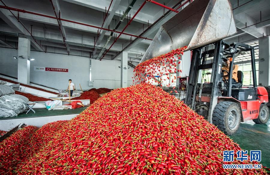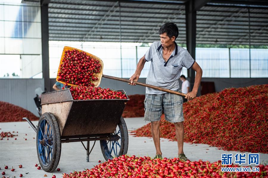 工人在貴州遵義市新蒲新區一家辣椒加工企業內轉運辣椒(2020年8月13日攝)。 新華社記者 陶亮 攝