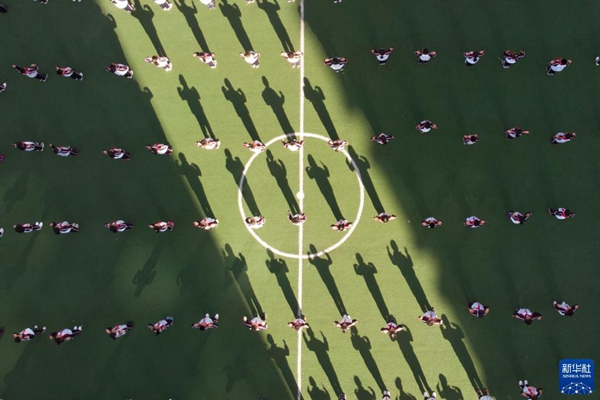 10月8日,哈爾濱市群力兆麟小學(xué)的學(xué)生在上課間操(無人機(jī)照片)。